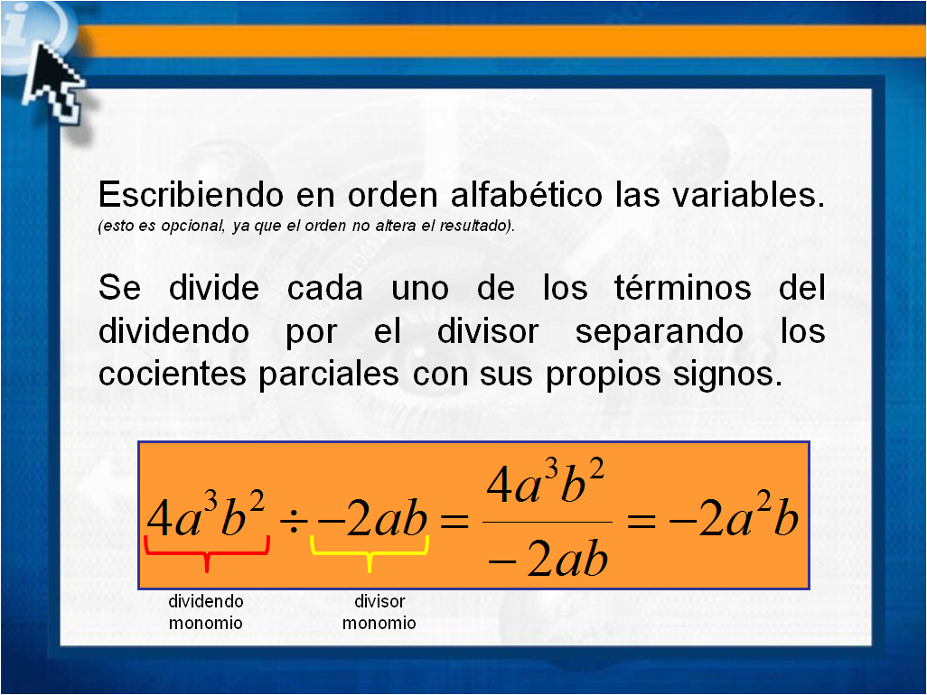Para dividir monomios seguimos aplicando lo que sabemos sobre operaciones con números sin necesidad de aprender procedimientos nuevos.